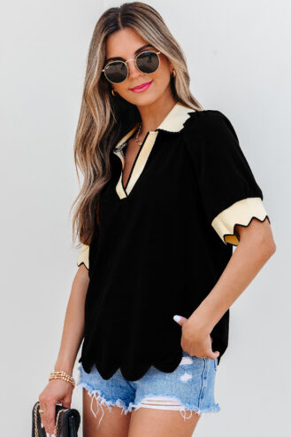 - A chic and feminine blouse featuring a contrast scalloped hem, collared V-neck, and puff sleeves for an elegant touch. Made from a soft polyester-cotton blend, this casual yet stylish top offers a comfortable fit. Perfect for daily wear, it pairs effortlessly with jeans, skirts, or casual pants. Ideal for work, semi-formal, or casual occasions. A hot-selling summer blouse for wholesale!